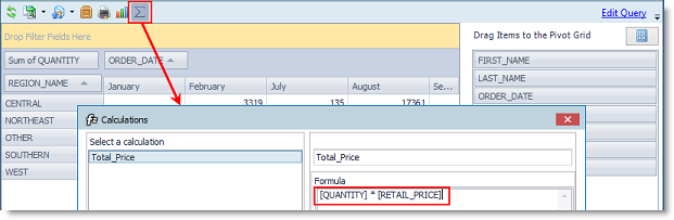 10. Remove the QUANTITY field from the Data Area by dragging it back to the fields list. Now drag the Total_Price calculated field you just created to the Data Area. The result is a pivot grid showing total sales per region for each month.