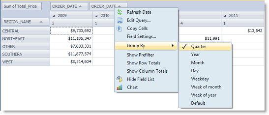 12. One very convenient feature of the pivot grid is the way it groups dates. To demonstrate this, right-click the ORDER_DATE field in the Column Area and select Group By. From the list, select Year. Then add the date column a second time and select Group By | Quarter.