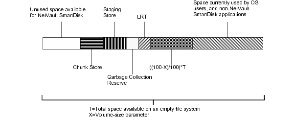 NetVault SmartDisk uses storage space in each volume up to a threshold amount that includes space directly set aside using the volume-size parameter, and the Last Resort Threshold (LRT) amount set by NetVault SmartDisk internally.
