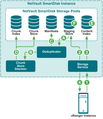 • Chunk Store Daemon: The NetVault SmartDisk Chunk Store Daemon is the only process that writes to the Chunk Index and Chunk Store. There is only one CSD per NetVault SmartDisk Instance. The CSD also manages the Garbage Collection process.