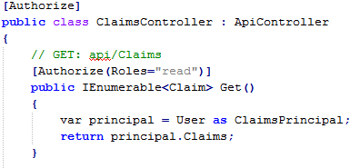 The standard Authorize attribute can be used on the Web APIs to restrict access. The Authorize attribute supports restrictions based on role and user claims which, by default, map to the claim names role and preferred_username.