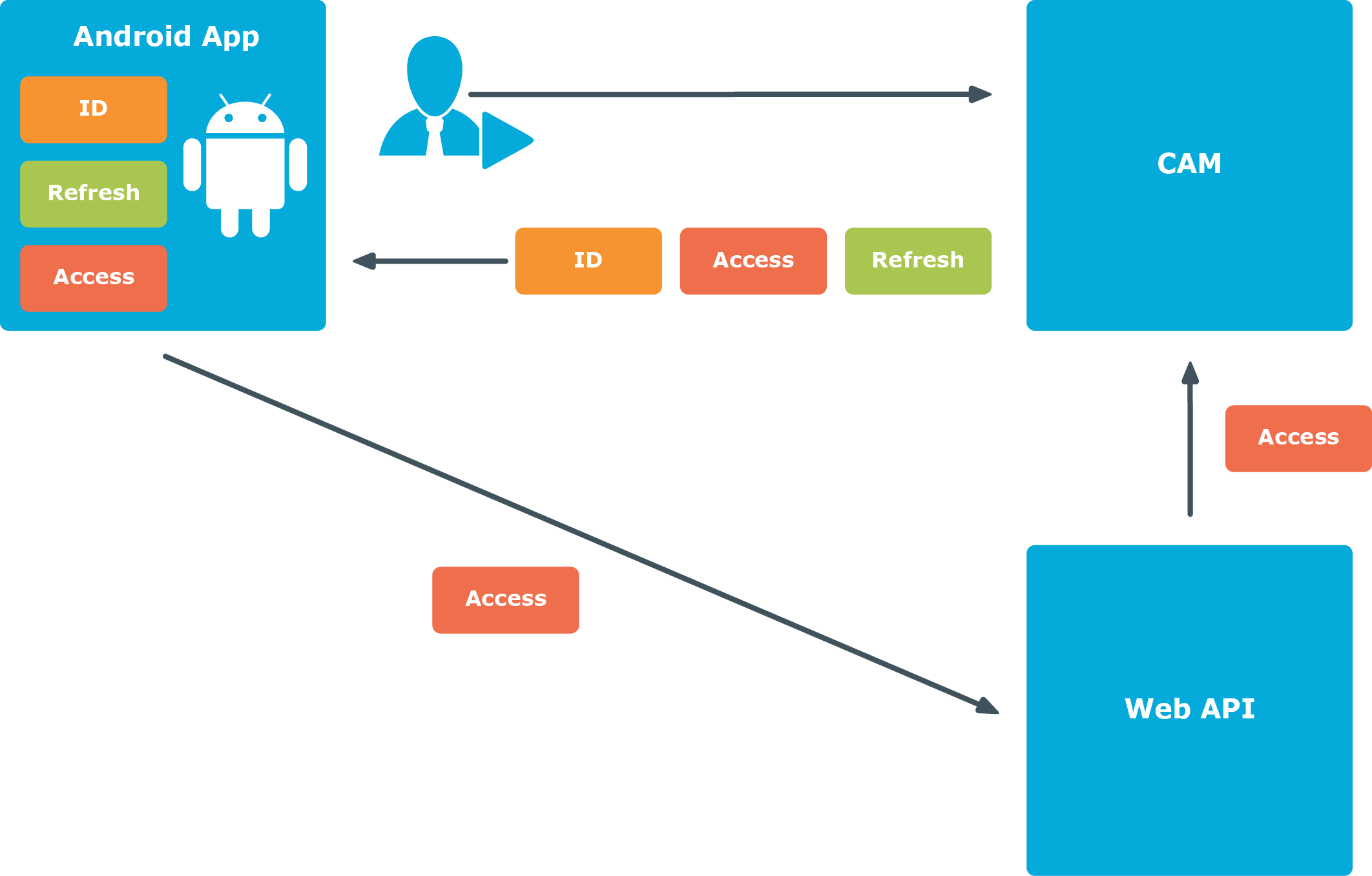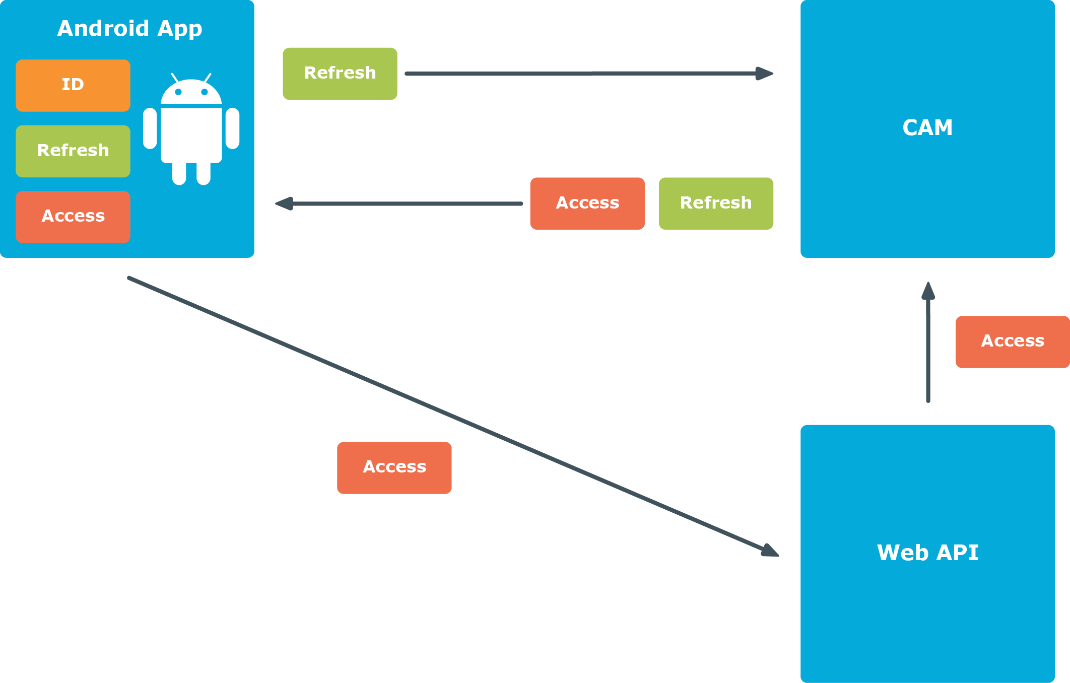 Using the OpenID Connect protocol, the Android application authenticates the user against Cloud Access Manager and retrieves a set of three security tokens, as shown in Figure 1. The security tokens are known as the ID Token, Refresh Token and Access Token.
