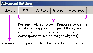 Most of a connector’s configuration settings are entered and edited in the Connector Creation Wizard, as described in the preceding section, but a few other settings can be entered in a separate Advanced Settings dialog box. CMN’s Directory Connector lets you fine-tune the attribute mappings, object-selection filters, and attribute associations (for source-target object matching), individually for each defined connector.