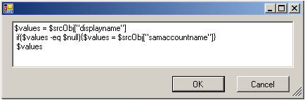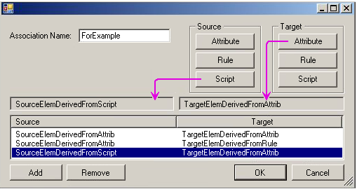 Script: Enter a script (see example in the screenshot below) to determine the values to assign as the source or target comparative element of this association. Type the script into the text box, and click OK.