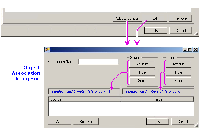 Clicking OK from the Attribute, Rule or Script dialog box tells the program to dismiss the dialog box and insert the attribute name or the newly defined rule or script into the appropriate comparative-element field of the Object Association dialog box.