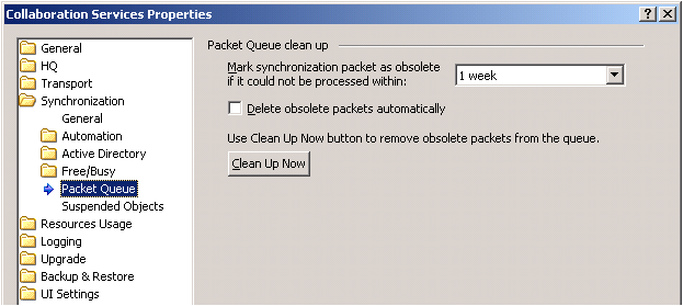On the Packet Queue page, select the time interval for the Mark synchronization packet as obsolete if it could not be processed within: setting. The default is one week and the setting has a range from one hour to one year.