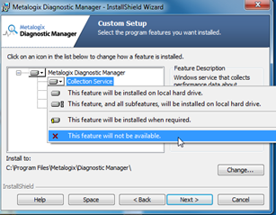 b.In the Custom Setup page, for each component you do not want to install, choose This feature will not be available from the drop-down.