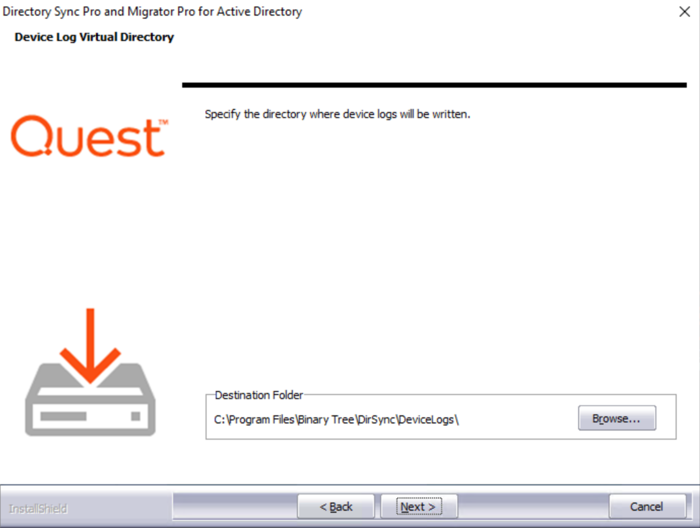 The Device Log Virtual Directory screen appears. Click Browse to choose a different location where device logs will be written. Click Next to continue.