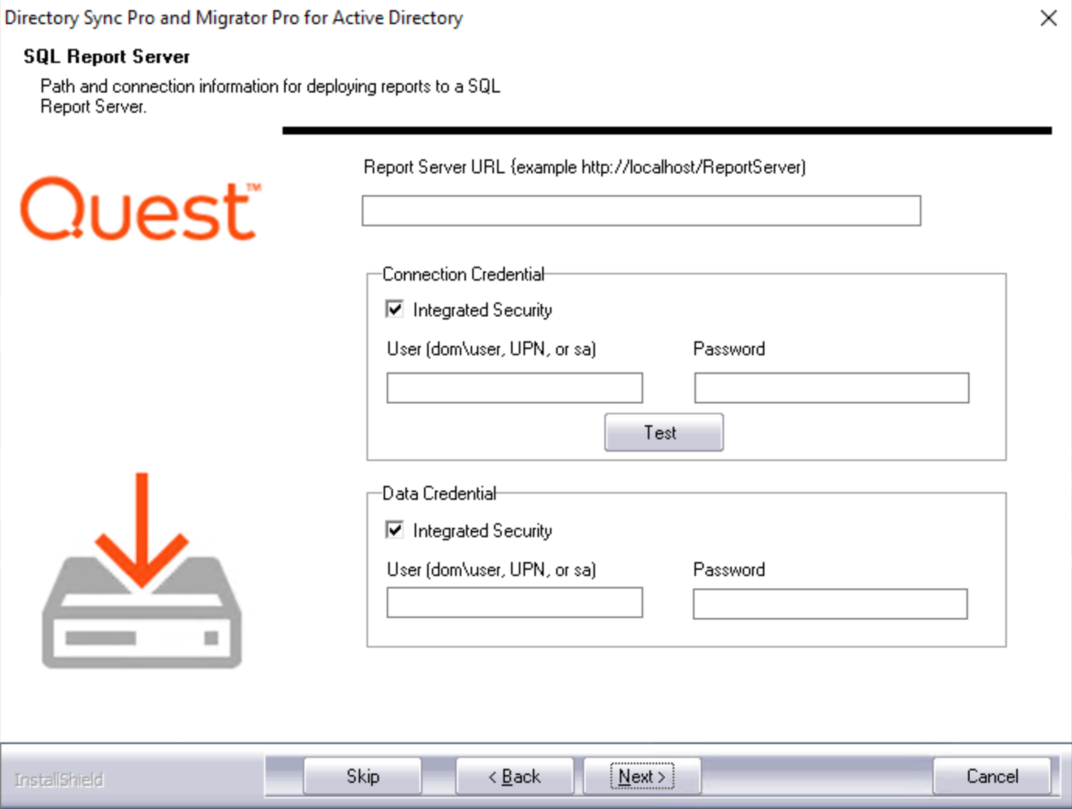 If you selected to install the optional Reporting feature, the SQL Report Server screen appears. Enter the Report Server URL and select the appropriate Connection Credential and Data Credential options. Clicking the Test button to verify the SSRS connection credential is a best practice. See the Appendix of this document for information on verifying the Report Server URL. Click Next to continue. If SQL Server Reporting Services (SSRS) is not set up, click Skip and OK on the confirmation window.