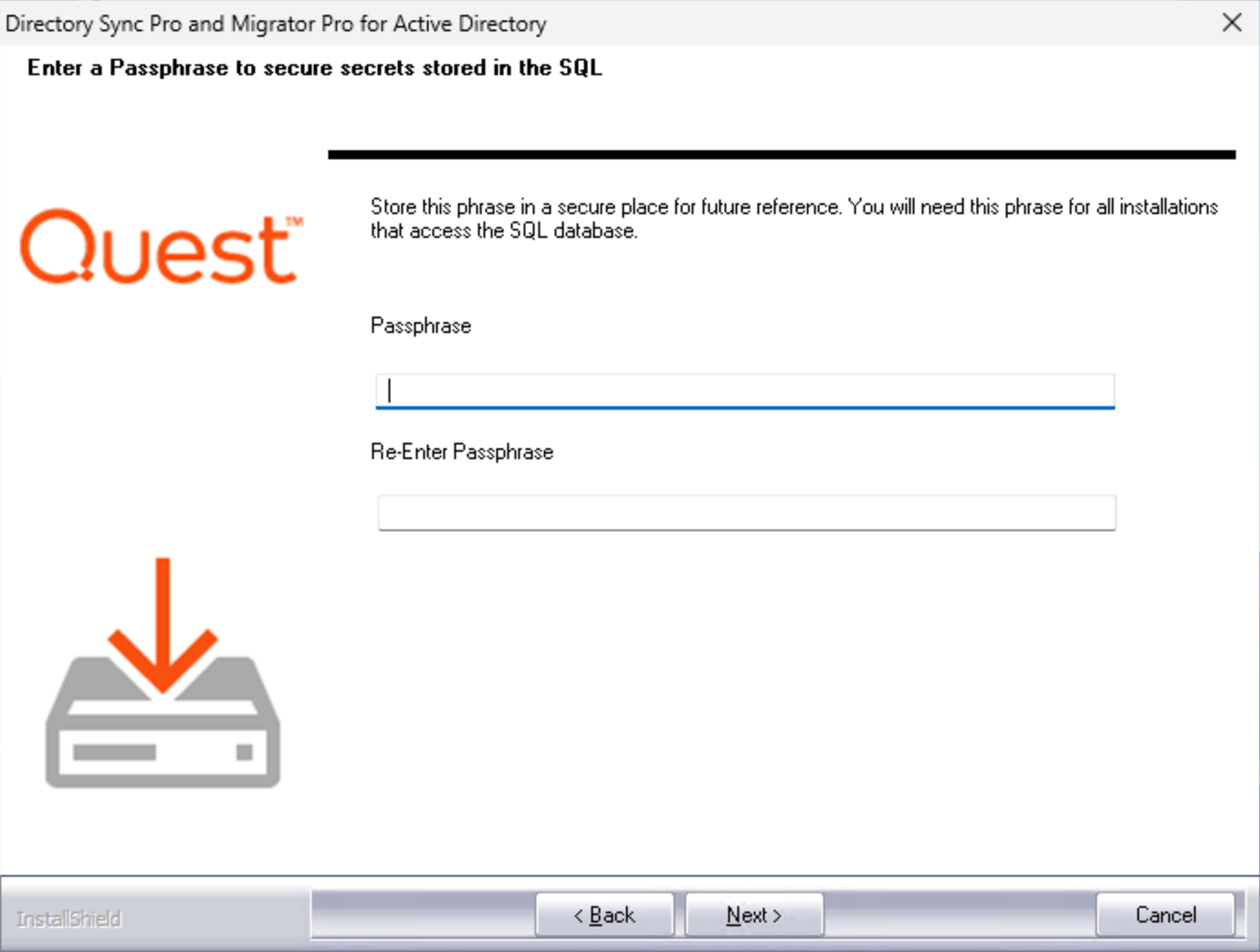 The SQL Passphrase screen appears if the passphrase was never entered on the current machine. The passphrase is required because once a database has been stamped with a passphrase, subsequent installs that reference the same database require the same passphrase. Enter the passphrase that was used during the initial installation of the SQL database. Click Next to continue.