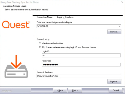 4. The Database Server Login screen appears again, this time for the logging database. Enter the SQL Database Server location for the logging database, credential information, and database name. Click Next to continue.