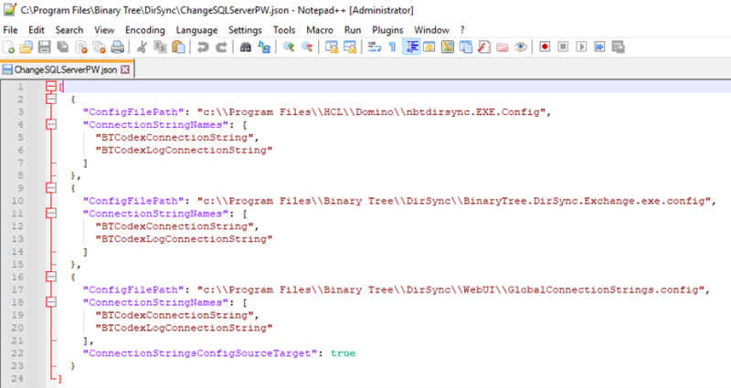 The SQL Server Change Password Utility can be used to change the Directory Sync Pro connection strings, in the Domino and Windows server configuration files, used to access the SQL server. The utility is configured by editing the ChangeSQLServerPW.json file.
