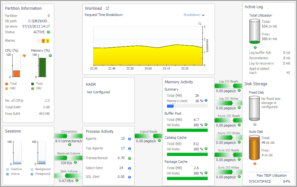 If the database is configured for HADR, the HADR pane displays the associated HADR metrics for the partition. It is located in the middle of the Partition (Real Time) home page.