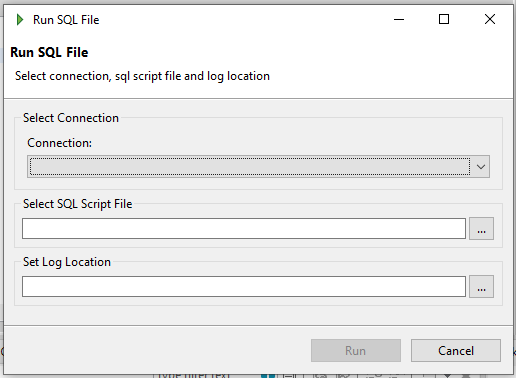 Toad Edge supports direct SQL script operation without opening script in the worksheet. Select the connection from the drop-up menu on which you want to run the script. Select the SQL script file and set the log location to run the SQL file directly.