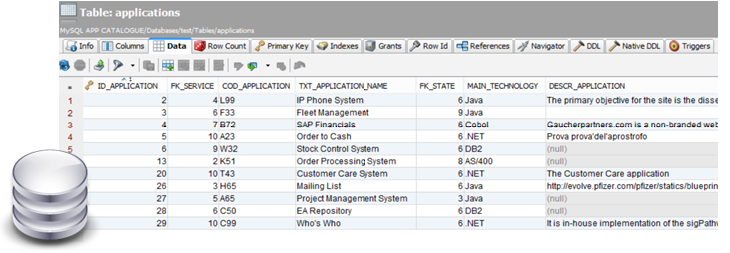 •a Service Catalogue manages enterprise services data, stored in a MS SQL database table. The service table identifies the item with a “COD_APPLICATION” field, which is differentiated by the Erwin ID of the model for the same item: