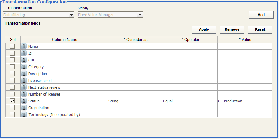 To optimize the data flow, filter source data in order to export only the more recently updated. Use then a “Data filtering”, “Fixed Value Manager” to manage only services with “Status” equal “6 – Production”.