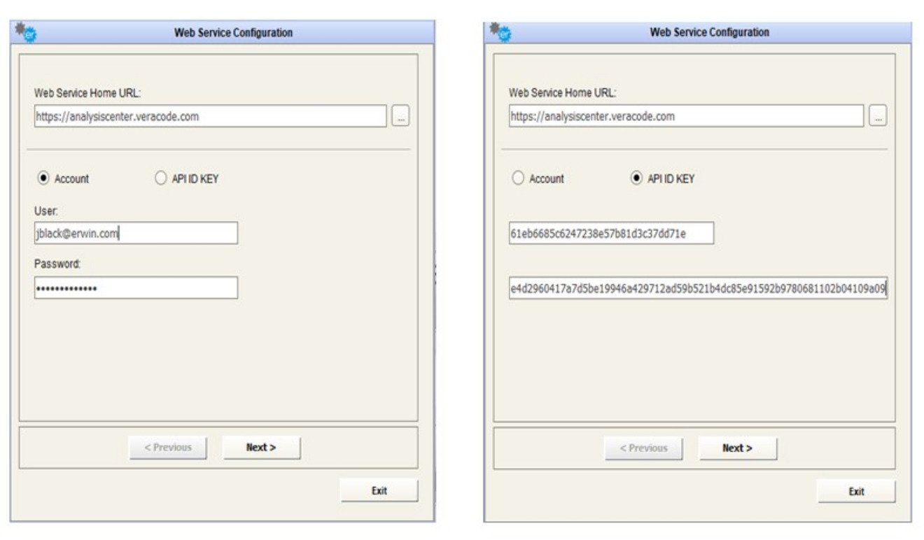 To use the adapter for Veracode, to import application data, fill the field “Web Service Home URL” with the Veracode URL you want to connect to. Then, provide a valid username/password to connect, or the API credentials (ID/KEY), that can be generated by a valid account.