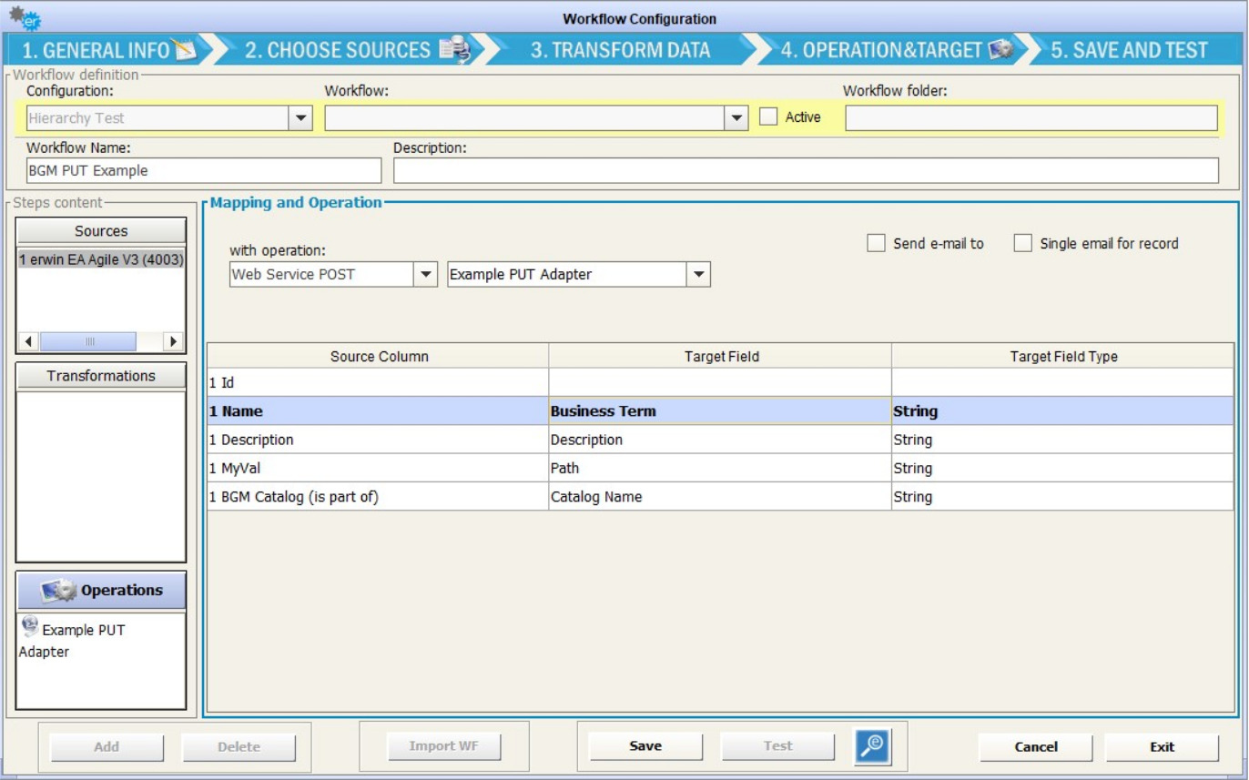 The adapter can now be used as a target endpoint when mapping data in a workflow. To select the adapter as a target, select “Web Service POST” as the operation and select your BGM adapter. A mapping table will appear, allowing the source fields to be mapped to relevant target fields for creating BGM Business Terms.
