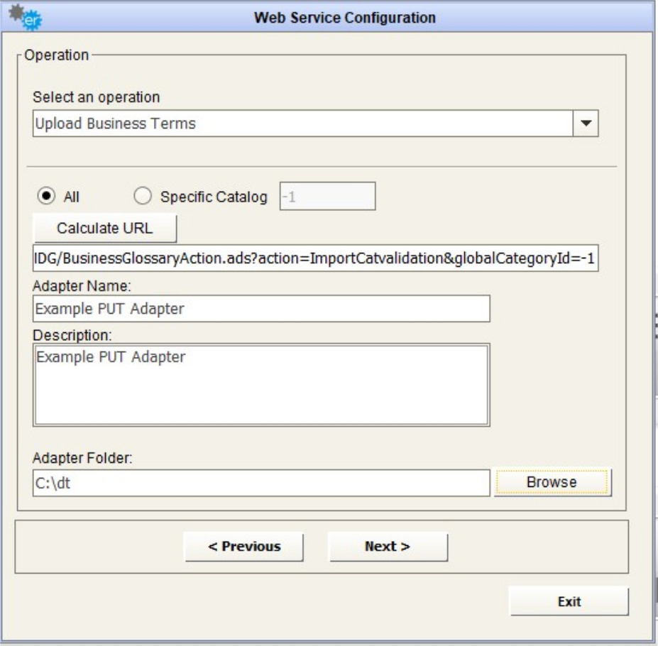 Click the button to proceed to the next step, and select the operation “Upload Business Terms”. Specify the a specific Catalog ID or select “All” and click the