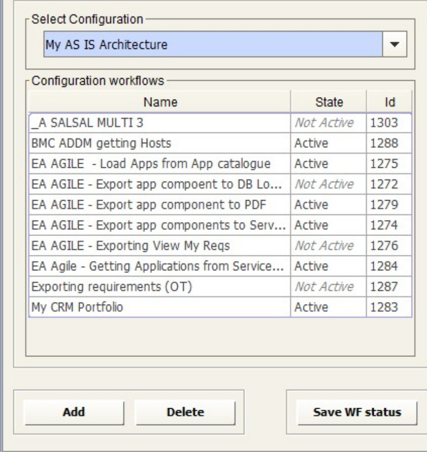 At the left side of model configuration window, is a list of the existing workflows created to manage information flows in and out of that model. In particular, you can see the name, the activation status and ID of each (useful for troubleshooting purposes, see later).