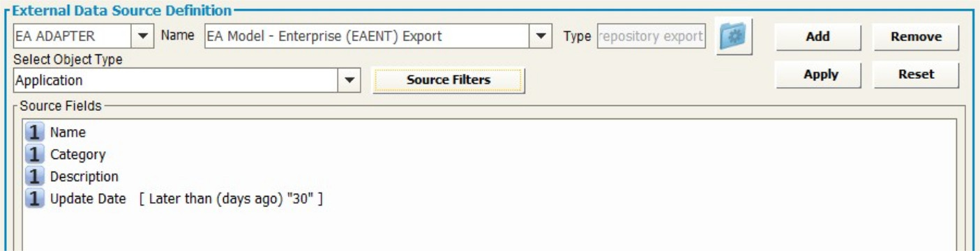 It’s also possible to choose which Properties/Associations extract through an EA Adapter for the selected object type. The “Source Filters” button allow user to pick only the desired information from a model, while default operation includes all of them.