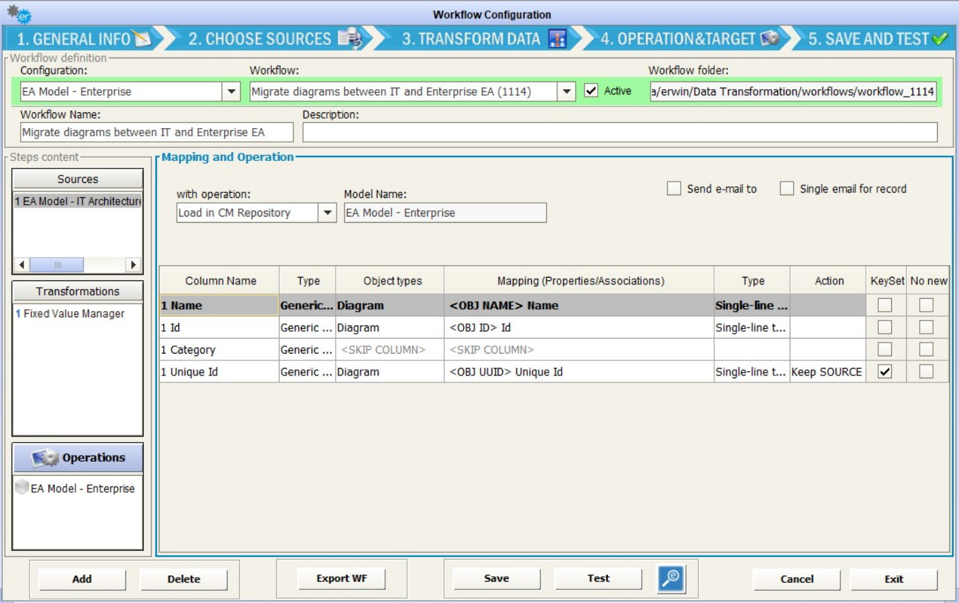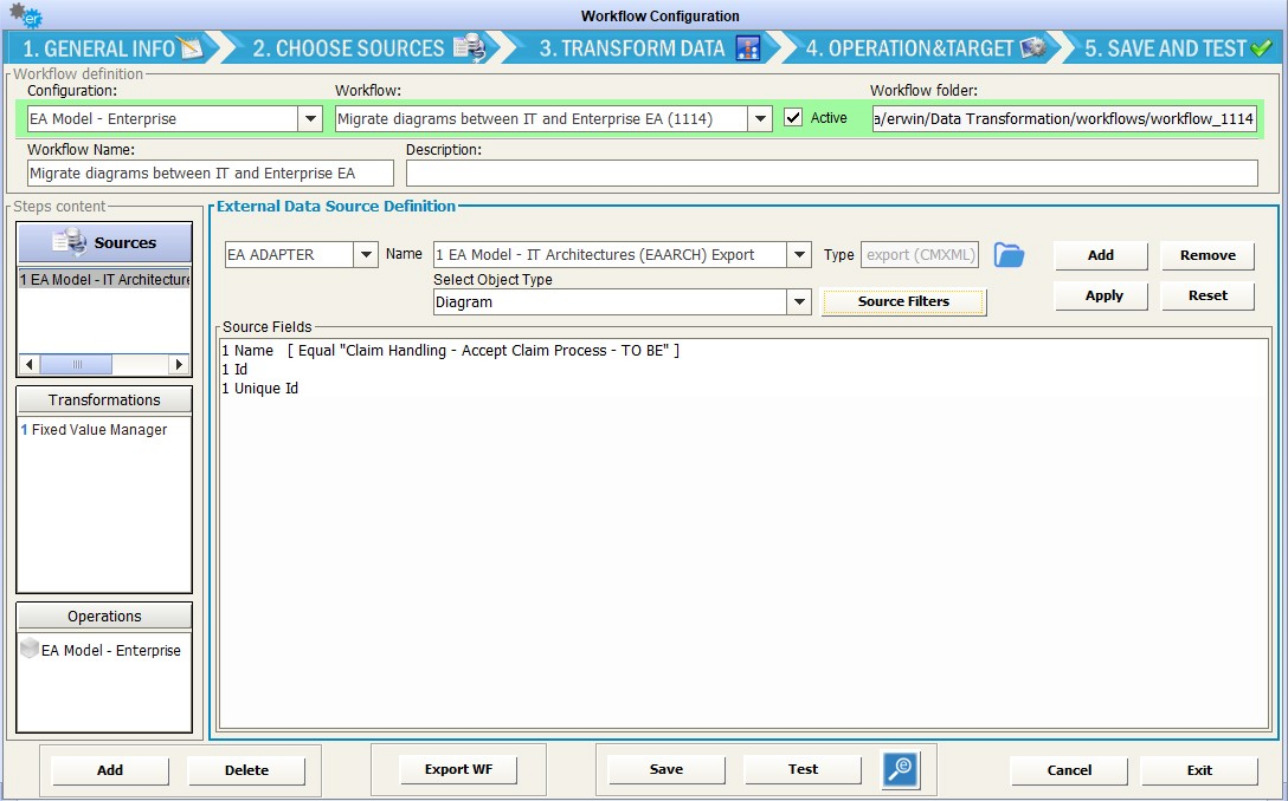 Then, create a workflow selecting the target model configuration, and select as the source model EA Adapter, Diagram object type as data source, selecting at least Name, Id, Unique Id fields: