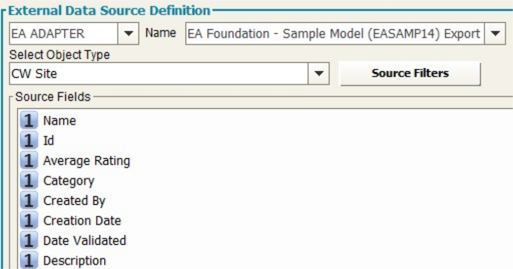4. Add a second source EA Adapter and select the export adapter related to your source model: select CW View as object type and filter the following properties/associations: