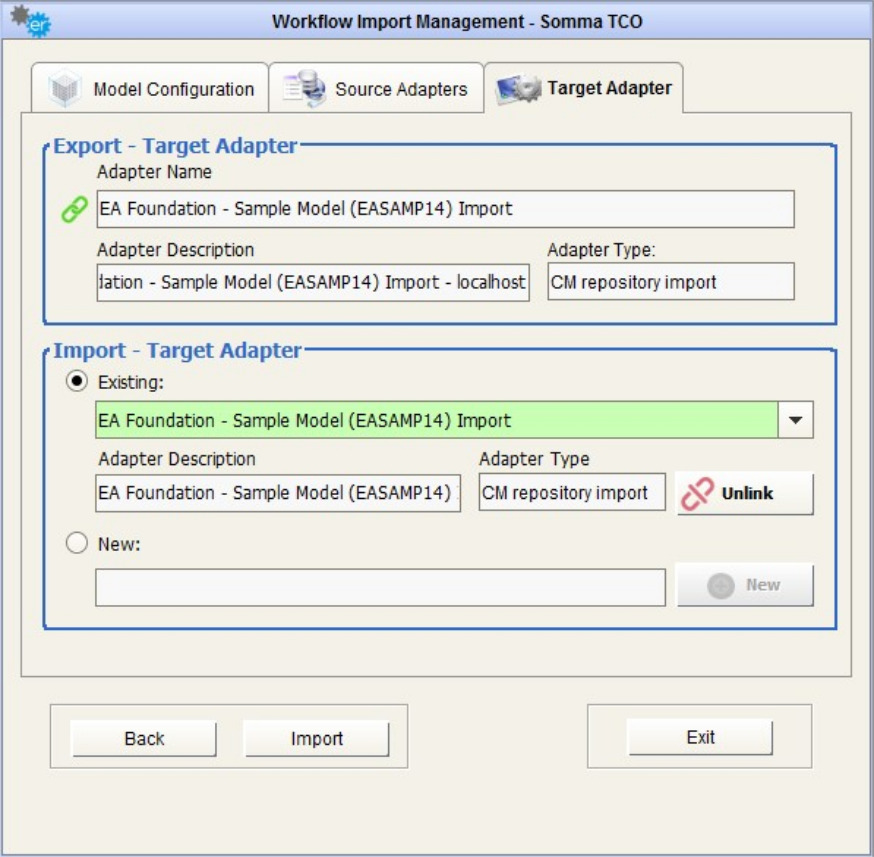 Then map the model configuration, source(s) adapter(s), and target adapter. In every step, should the needed configuration or adapter not exist in the target DT instance, it can be contextually created, allowing for smart import operations: