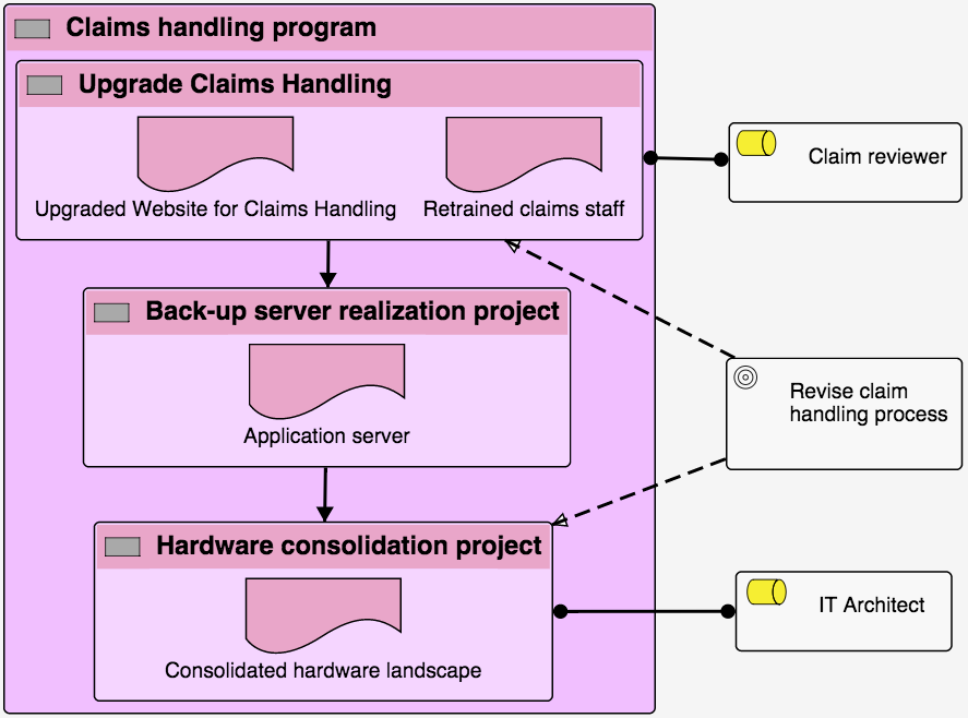 This viewpoint is used to show the work packages and their deliverables.  It also shows the goals that the work packages realize, and the stakeholders (Business roles) involved.