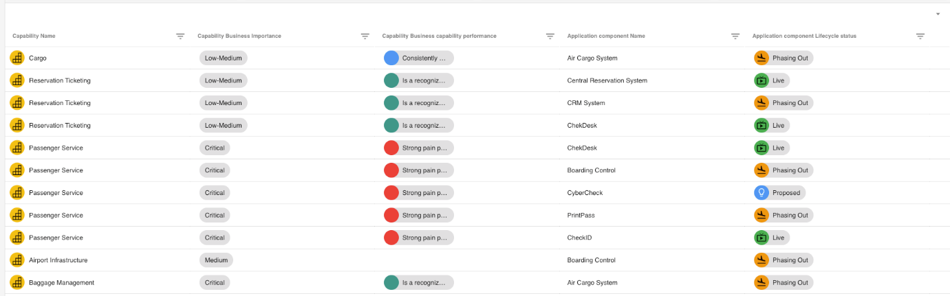 An example of a Table View using a Query data source to display a journey from Capability to Application Component whilst display properties of each element