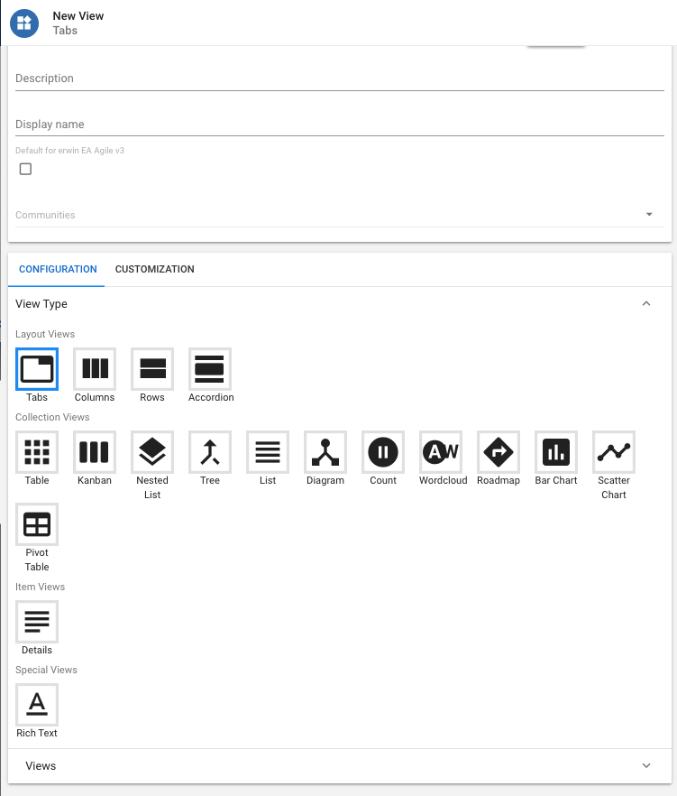 There are two main ways to create a new view in the erwin EDGE Platform: Through the System menu or when in Configuration Mode, through the blue + button found in view selection lists.