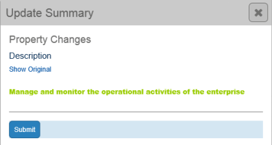The Update Summary area presents a summary of the changes made using the Text Editor to the User. Clicking on the Show Original instruction will reveal the           original state of the modified text.