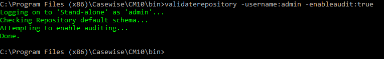 e.g. validaterepository -username:admin password:test -enableaudit:true