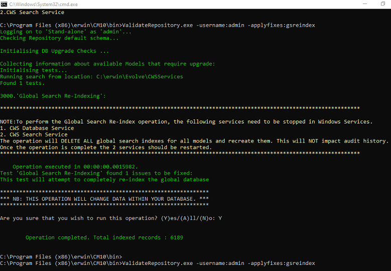 C:\Program Files (x86)\erwin\CM10\bin>ValidateRepository.exe -username:admin -applyfixes:gsreindex