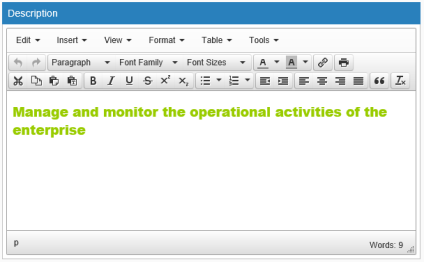 The Text Editor incorporates an HTML content editor to provide rich text formatting options for multi-line descriptive fields. The Text Editor option is only available for the Memotext Property Type with the Enhanced Multi-line Text Control setting enabled on the Property Type Page.