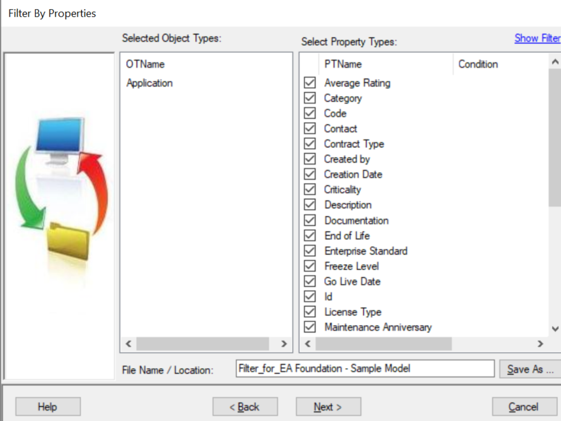 The type of filter shown and the data entered will depend on the property. In the example above, it is a category property with know values and the user can choose one or more. The application will then only output results where the category matches this selection. If the user chooses to save this file by clicking the "Save As" button, opening the file again will show the user's original selection.
