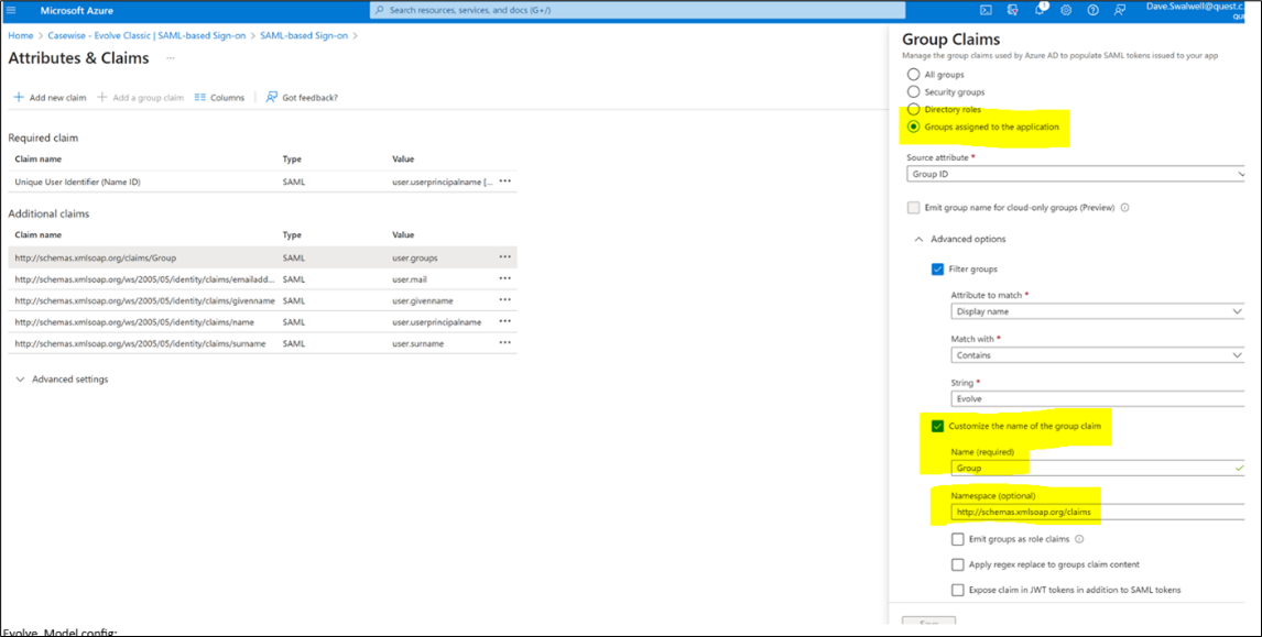 Under Advanced option, select Customize the name of the group claim check box.