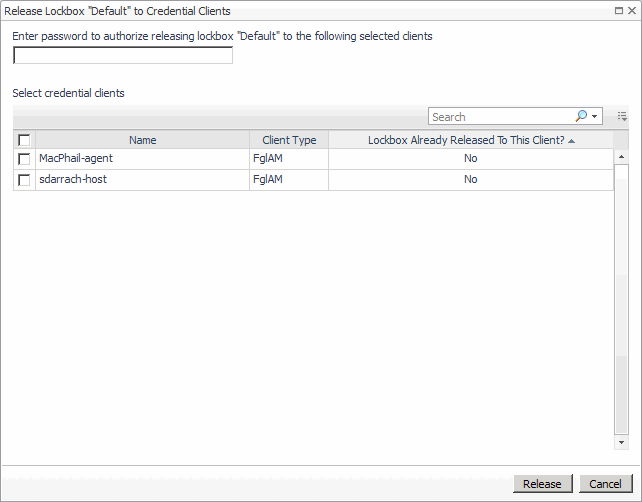 In the Release Lockbox to Credential Clients dialog box, type the lockbox password (if one exists) and select one or more credential clients (that is, Agent Managers) for lockbox release.