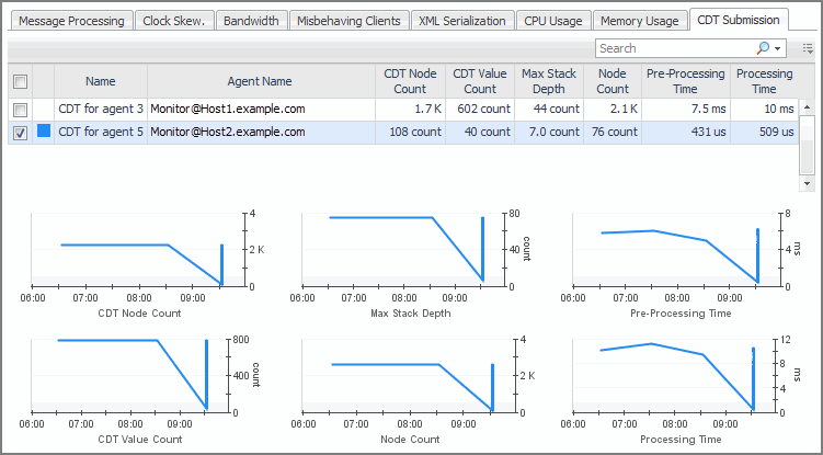 The CDT Submission tab displays information about the complexity of data that agents collect and submit for Canonical Data Transform (CDT) processing. Excessively large values or sudden increases in this data can result in performance problems.