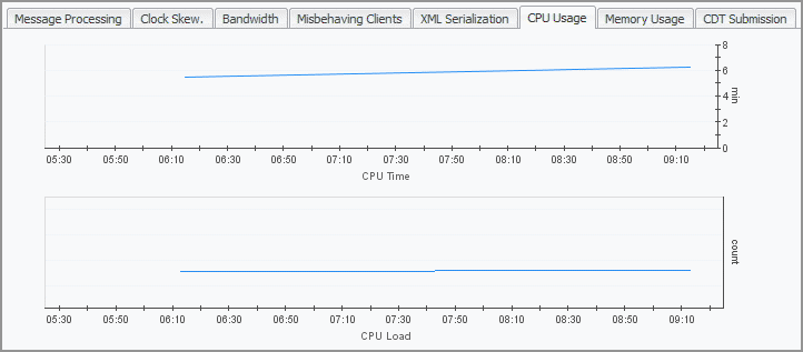 The CPU Usage tab displays the amount of time the CPU associated with a selected Agent Manager instance spends executing active processes and their number. For example, a sudden increase in CPU time may indicate that the user code is running inefficiently or a possible runaway process. Also, high CPU loads sometimes suggest that the host needs more CPU power to run efficiently.