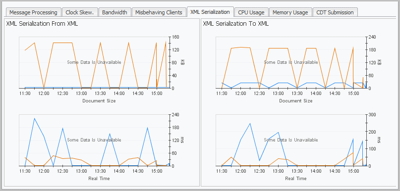 The XML Serialization tab shows graphs indicating the rates and times of message serialization to and from XML for a selected Agent Manager instance.