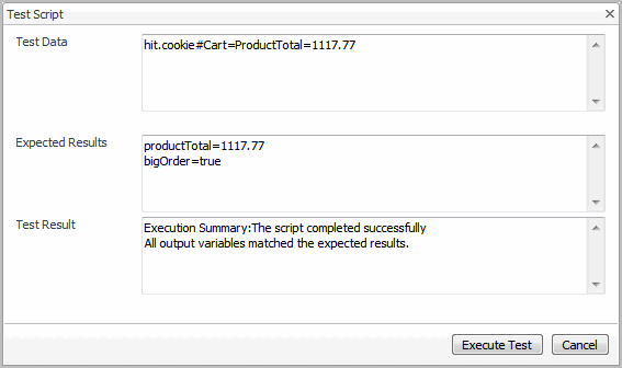 In the Script - Add dashboard or dialog box, click Test Script. To run a test, add some sample data, specify the expected results, and click Execute Test.