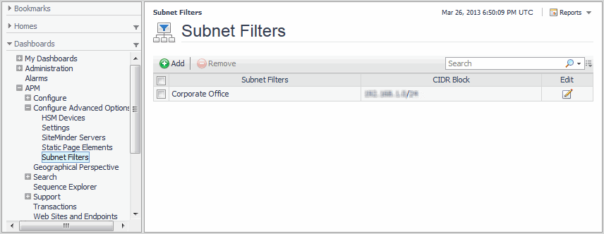 To configure Subnet Filters, navigate to APM > Configure Advanced Options > Subnet Filters.