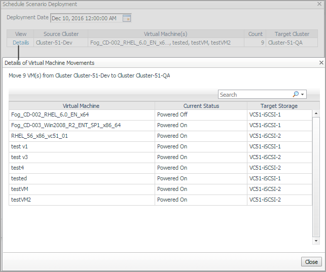 (Optional) In the Schedule Scenario Deployment dialog box, click Details to view details of Virtual Machine Movements. Click Close and return to the Schedule Scenario Deployment dialog box.