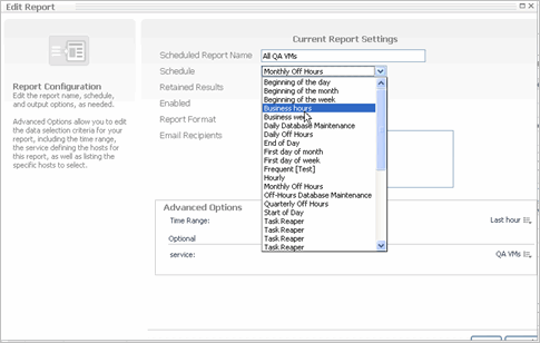 Schedule—reports can be large, it is best to accept the default of running the report Monthly Off Hours. Once configured, the report has a Run Now icon in the Reports view so you can run the report any time. |