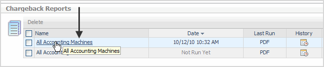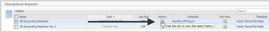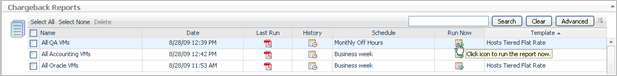 Chargeback Reports—shows all Chargeback reports that are scheduled and a history of previously run reports. Clicking on the name, schedule, or template for a specific report opens the Edit Reports view, allowing report edits or updates. Clicking on the Last Run icon (if enabled) allows immediate access to the last known static report that is available. If the selected report has been scheduled, but has not yet run, the Last Run icon appears dimmed out until the report runs. The History icon provides quick access to the previous reports that are stored in the system. Each column can be sorted, depending on individual preferences. A search field is included to help you quickly find reports. For more information, see Viewing, Running, and Deleting Reports. |