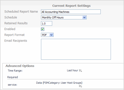 Enabled checkbox—checking this checkbox (the default) allows reports to run on its selected schedule. Unchecking the checkbox disables the report from running. |