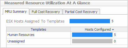 Measured Resource Utilization At A Glance—this view provides a quick visual summary of the hosts that have been assigned to the measured resource utilization model, as well as a visual breakdown of the host assignments within that model. This view contains a summary tab and tabs for both partial cost recovery and full cost recovery. All templates and their assigned hosts are listed under the tabs. |