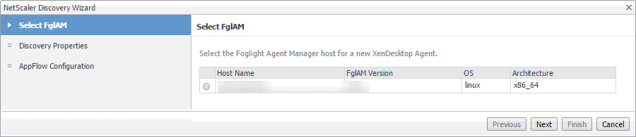In the NetScaler Discovery Wizard, on the Select FglAM page, select the host running the Agent Manager that you want to use to manage the agent instance you are about to create, and click Next.