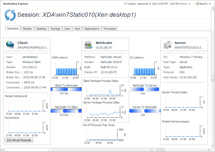 The Summary tab is the first tab that appears open by default when you access the XenDesktop Explorer for the first time. It displays general information about the selected session, such as its name, state, catalog name, type (desktop or application), support type, and the delivery group to which it belongs. This tab also provides a set of graphs that illustrate the rates of the selected session's round-trip time, WAN latency, WAN data transfer rates, and packet retransmission rates over the selected time range. Use that information to better understand how the session performs during a selected time period. Average site rates are also displayed, for comparison. In general, consistently high peaks in the graphs may indicates the signs of potential bottlenecks and should be investigated.